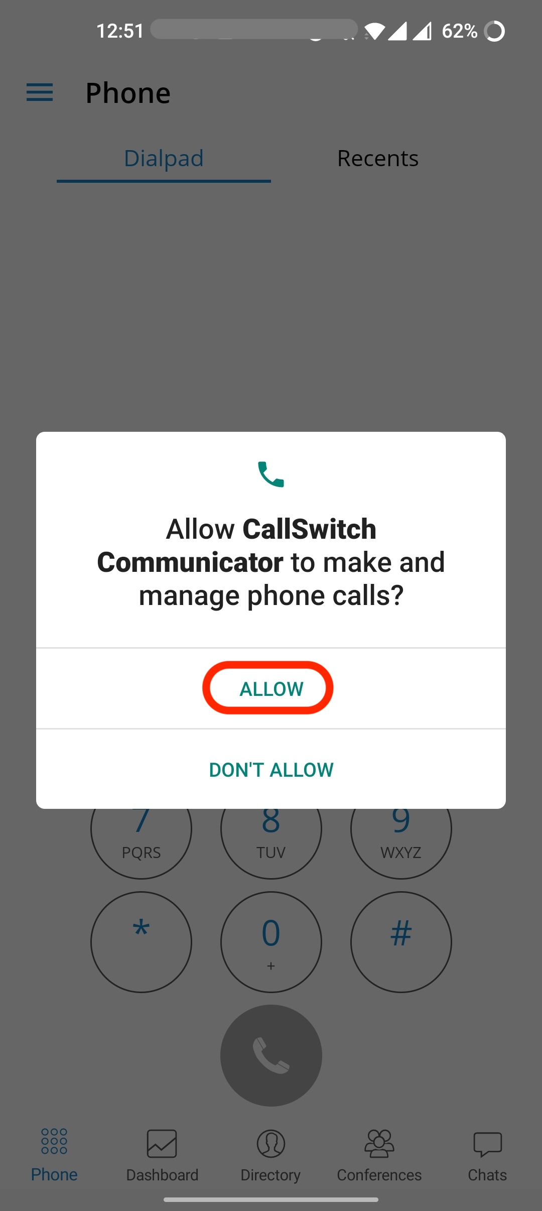 12. To let CallSwitch Communicator utilize the Do Not Disturb (DND) feature, on the "Persmission needed" pop up alert tap on "OPEN SETTINGS".